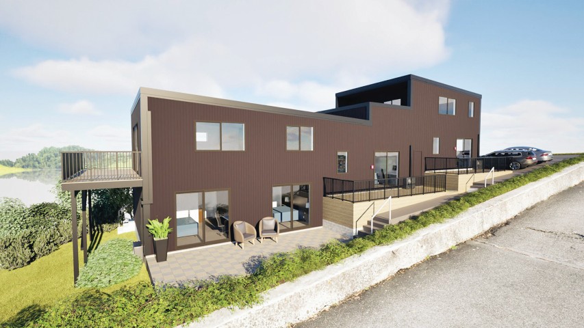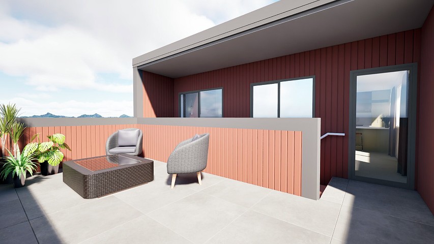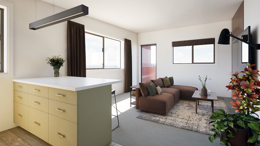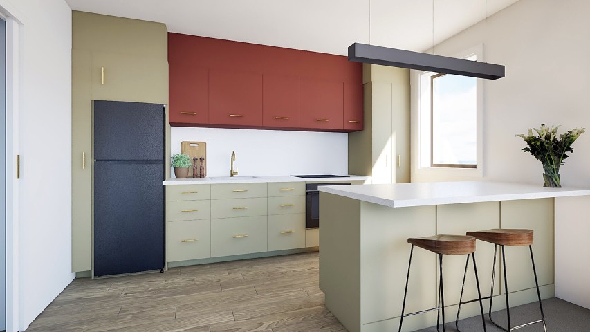 This apartment development embraces the contours of its site with a stepped architectural form and a warm, earthy exterior palette. Designed for modern urban living, the layout prioritizes light, outlook, and efficient use of space, delivering a sense of openness and comfort within a compact footprint. The exterior features vertical cladding in rich terracotta tones, contrasted with dark trims and clean, contemporary lines that lend the building a confident yet welcoming character. Inside, the interiors continue this grounded aesthetic with a thoughtful blend of olive and clay tones, natural timber textures, and soft brass accents to create a calm and timeless atmosphere. Each apartment is carefully planned to maximize livability and flow, offering open-plan kitchen and living areas, warm material detailing, and a cohesive modern feel throughout.